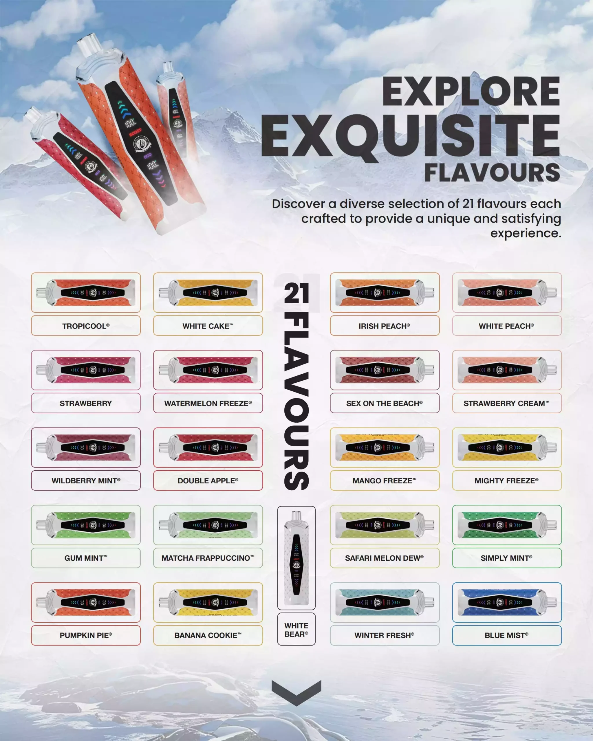 • Mango Freeze: Tropical mango with a frosty kick. Pure summer vibes.